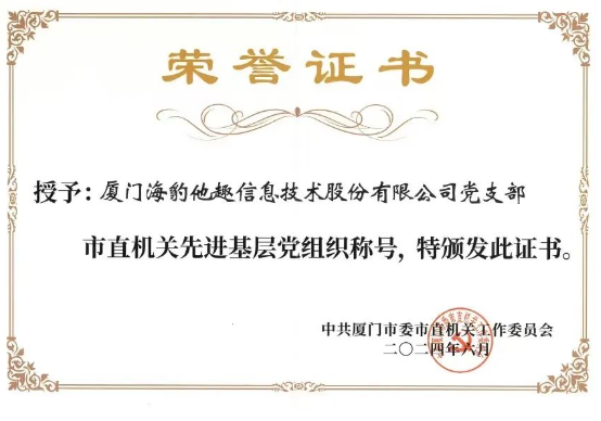2024年7月1日上午,厦门市直机关“两优一先”表彰大会召开,厦门市纪委监委、市委办、市委组织部、市委宣传部相关领导,市直机关工委领导班子成员以及市直机关各直属党组织书记,“两优一先”受表彰人员等出席表彰大会。会上,厦门海豹他趣信息技术股份有限公司党支部被授予“厦门市直机关先进基层党组织”称号。